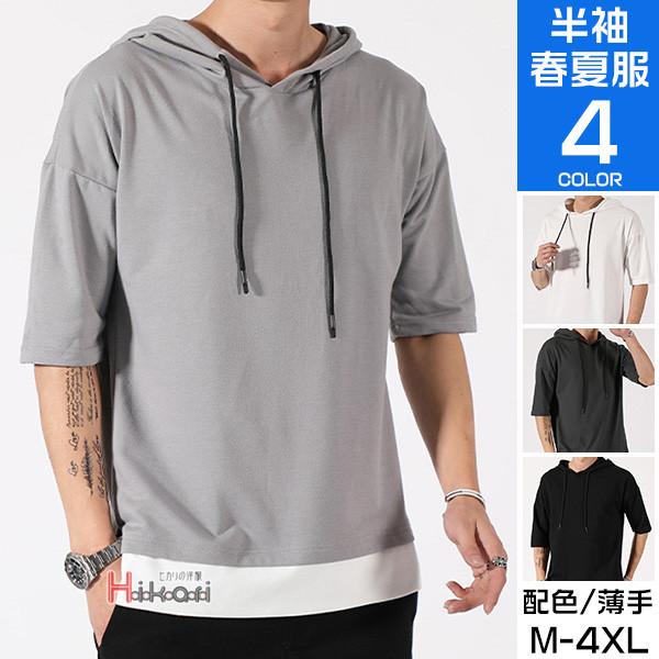 メンズ 夏 パーカー フェイクレイヤード カジュアル 流行 パーカー 半袖 Tシャツ ゆったり パーカー お兄系 大人気 19zxc084 メンズ ファッション トップス パーカー Hkstore